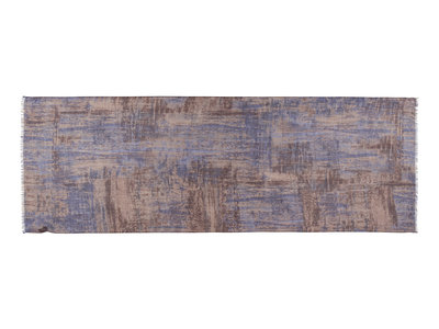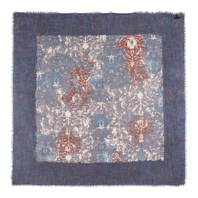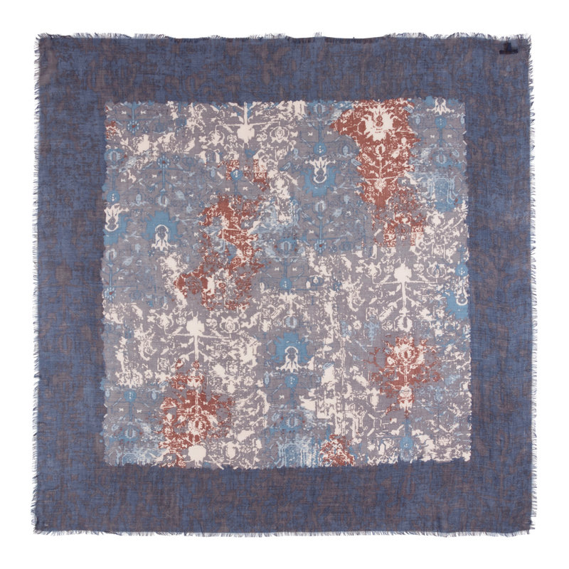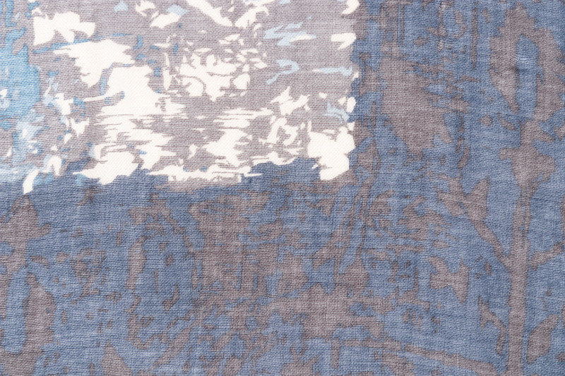 Blue, brown, and olive abstract print silk and cashmere scarf.