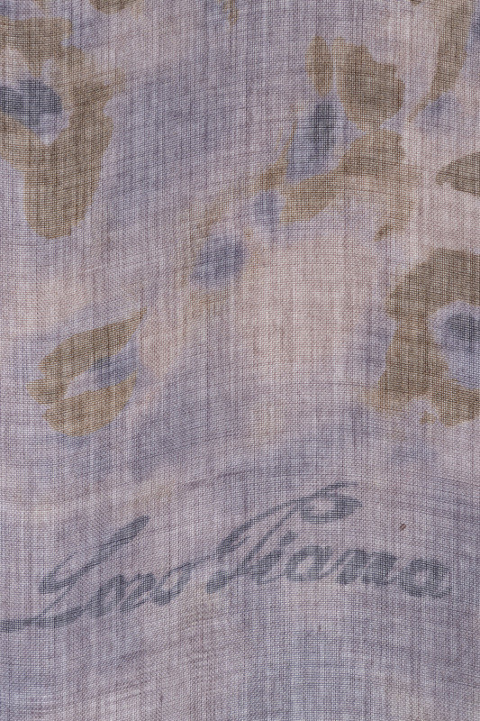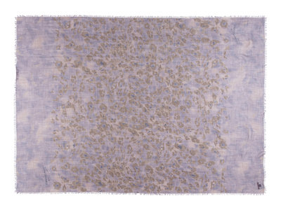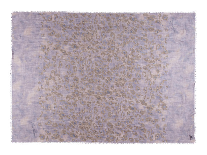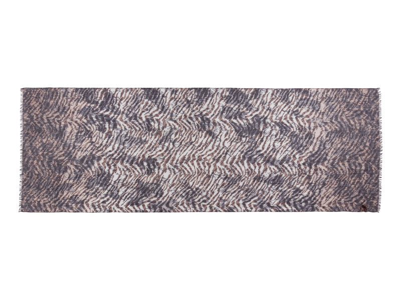 Brown, gray, and blue animal print cashmere and silk scarf.