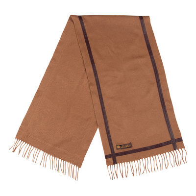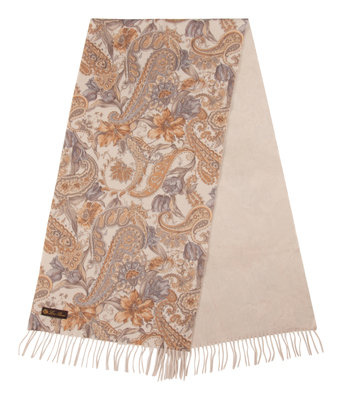 Ivory cashmere scarf with blue and camel floral paisley print.