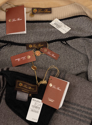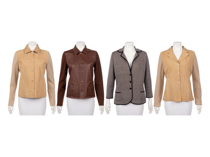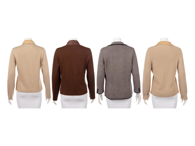 Tan suede and brown leather front and cashmere/silk blend knit reversible jacket with rolled collar, in-seam pocket, and front button closure. Found with original sales tag, listed price: $2,895.00.