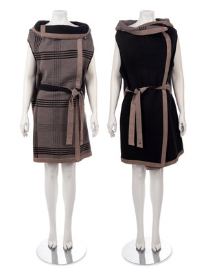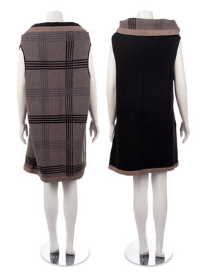 Brown and taupe cashmere plaid reversible poncho trimmed with suede; paired with matching suede belt.