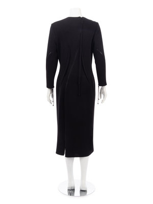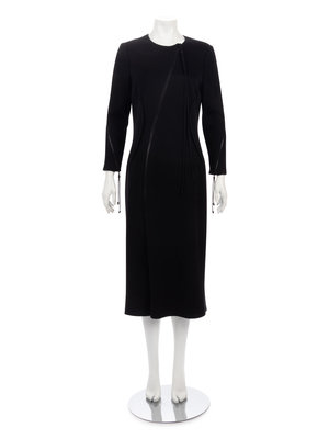 Black viscose blend long sleeve dress with zippered seams and external shaping seam details. Found with original sales tag, listed price: $5,510.00.