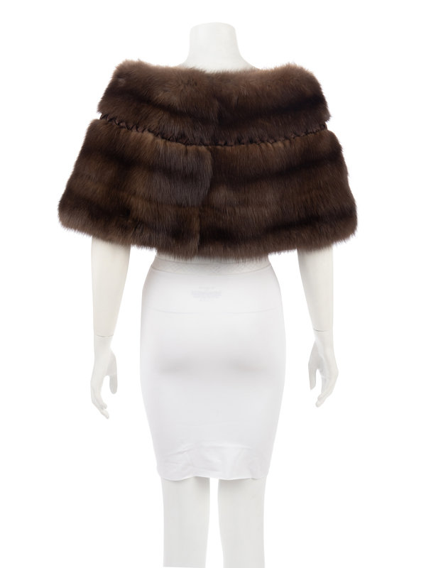 Brown sable fur shrug with brown silk satin ribbon braid and front bow and lined in brown satin.