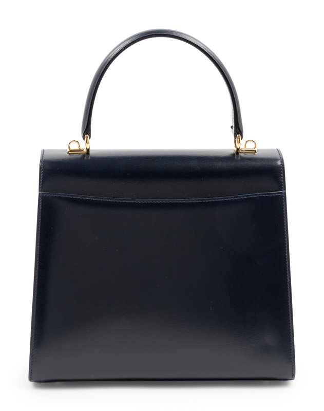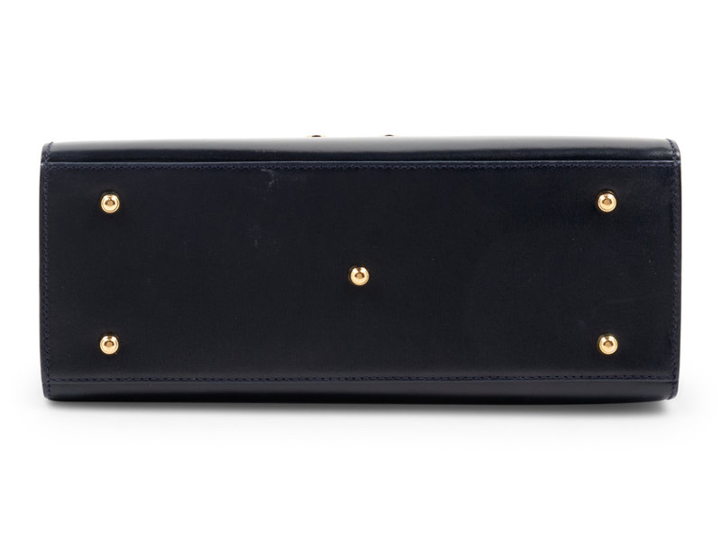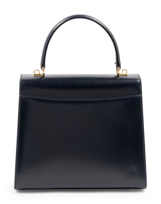 Navy leather handbag with gold-tone hardware, top flap, and spring clasp closure.