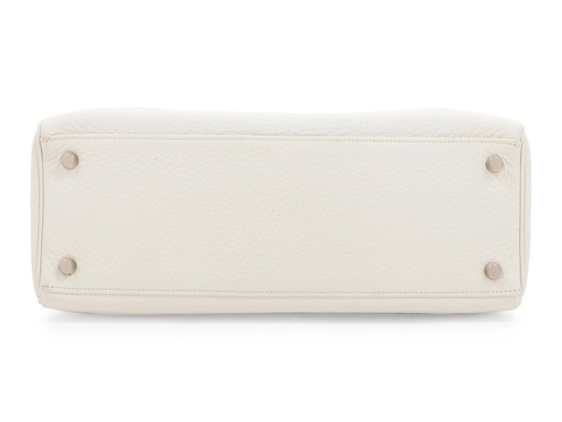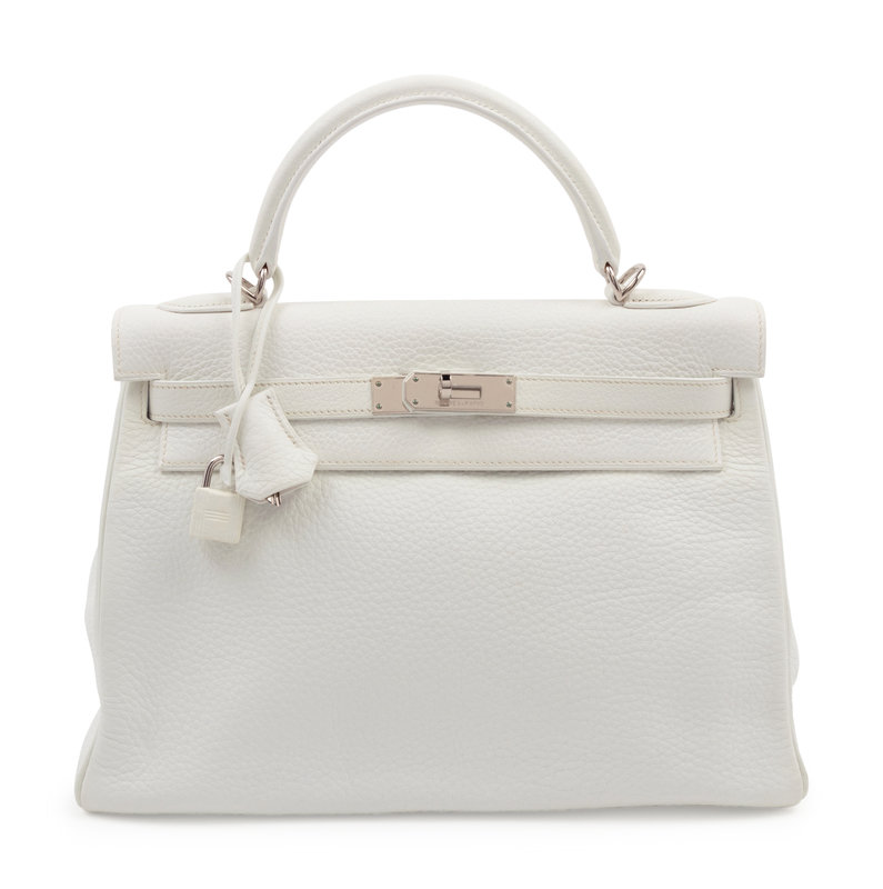 White leather Kelly bag with top handle, detachable shoulder strap, and front twist lock closure.