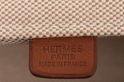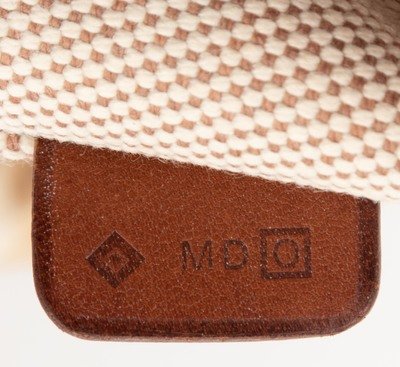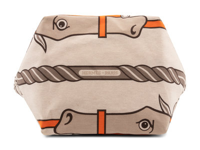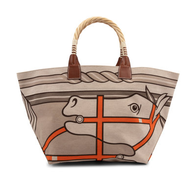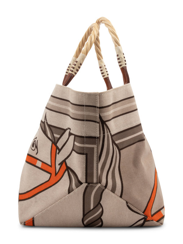 Limited Edition, "Quadrige" print canvas tote bag, riding crop wood handles with fauve goatskin accents- 2011.