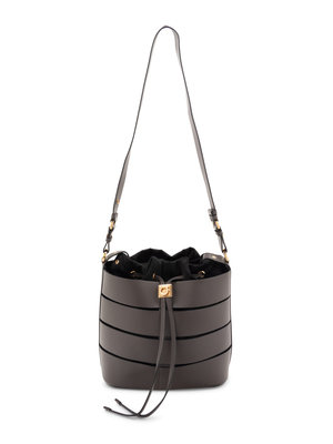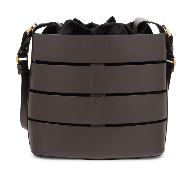 Gray leather bucket bag with detachable black satin lining and drawstring closure.