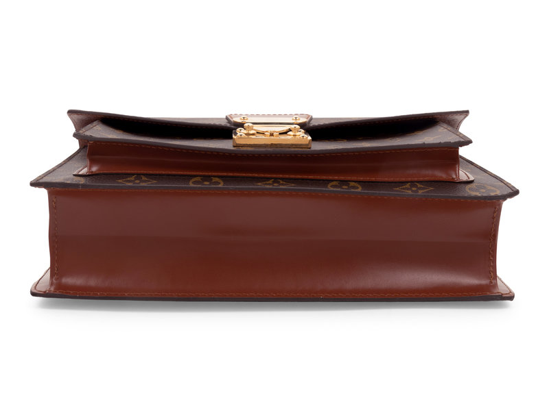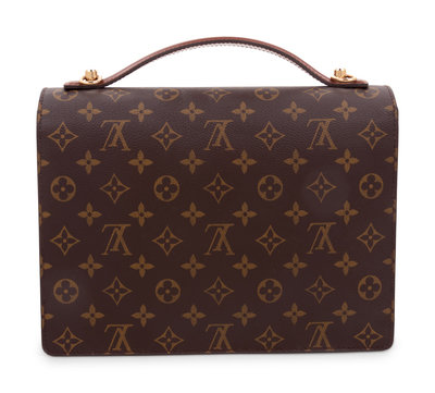 Monogram canvas Monceau 28 M51185 flap bag with brown leather trim and straps, and gold-tone pressure clasp front closure. Found with original sales tag, listed price: $990.00.