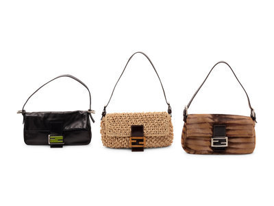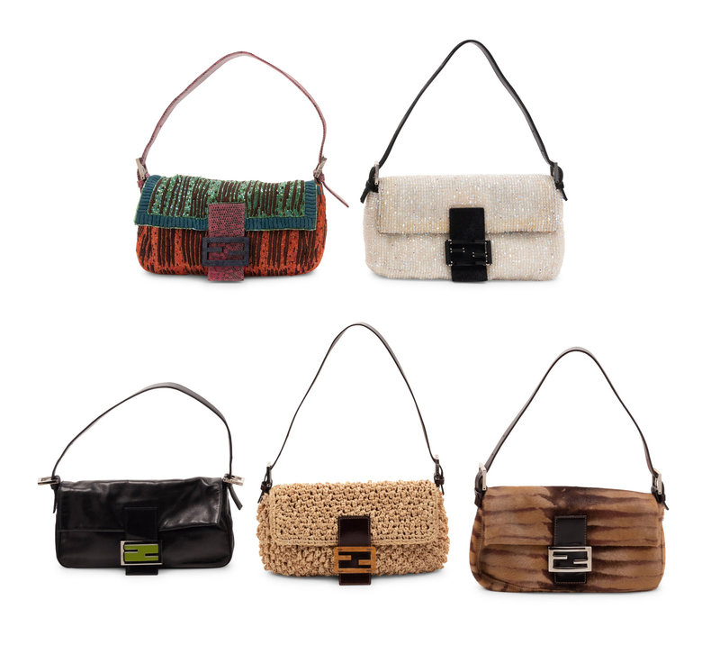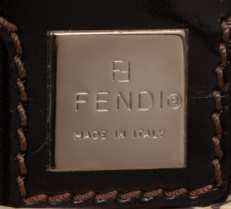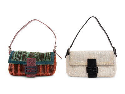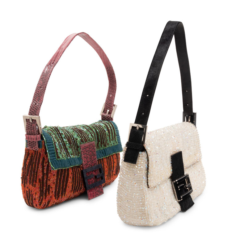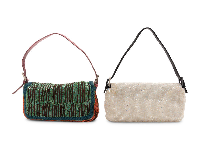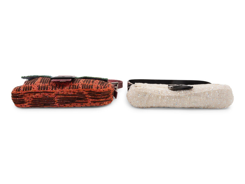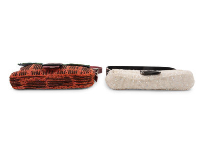 Orange and green sequined baguette bag trimmed with brown embroidery and pink lizard skin, and front magnetic snap closure. Found with original sales tag, listed price: $2,295.00.