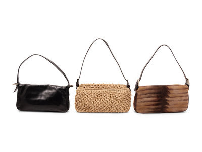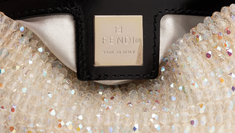 Clear cut crystal bead baguette bag trimmed with black hair trimmed leather, and front magnetic snap closure. Found with original sales tag, listed price: $4,995.00.