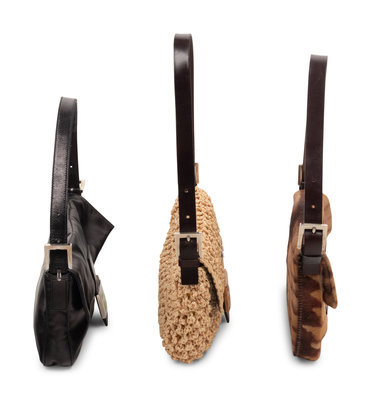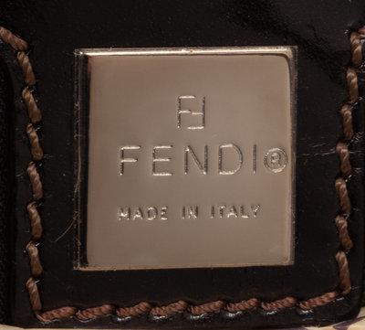 Brown and tan stripe printed hair baguette bag with brown leather strap and front silver-tone buckle, and front magnetic snap closure.