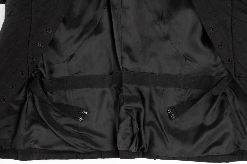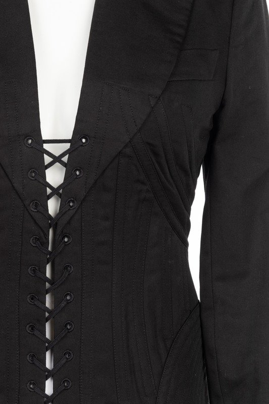 Black cotton blazer with fish-eye lapels, quilted hips, and built-in corsetry, internal waist belt, and center front lace up closure. Comes with laces.