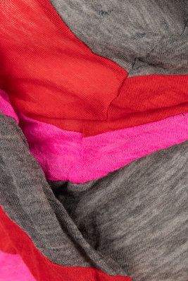 Red, gray, and pink color blocked knit shift dress with draped bustline and flared skirt.