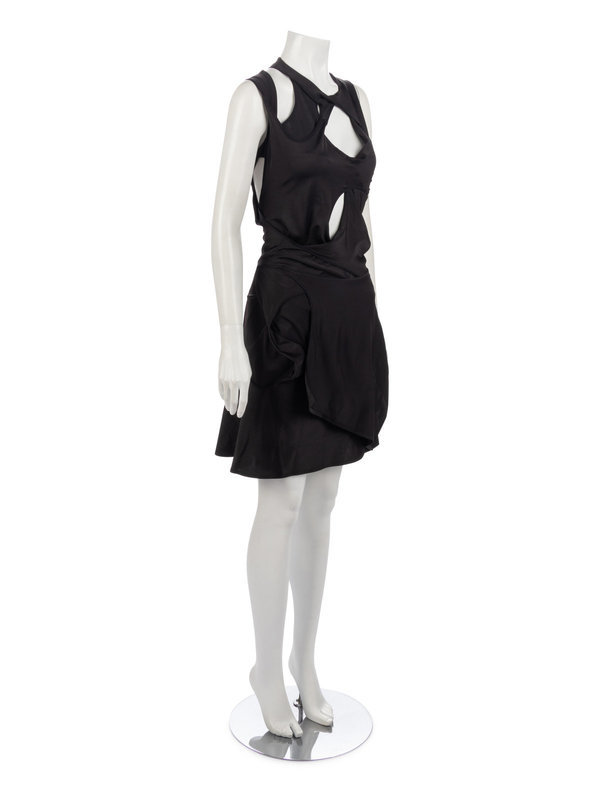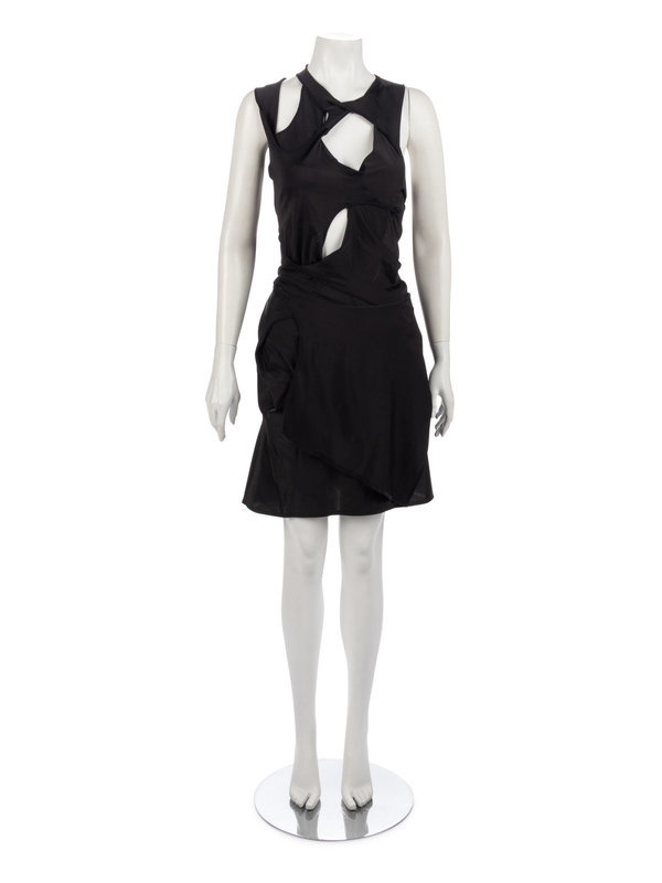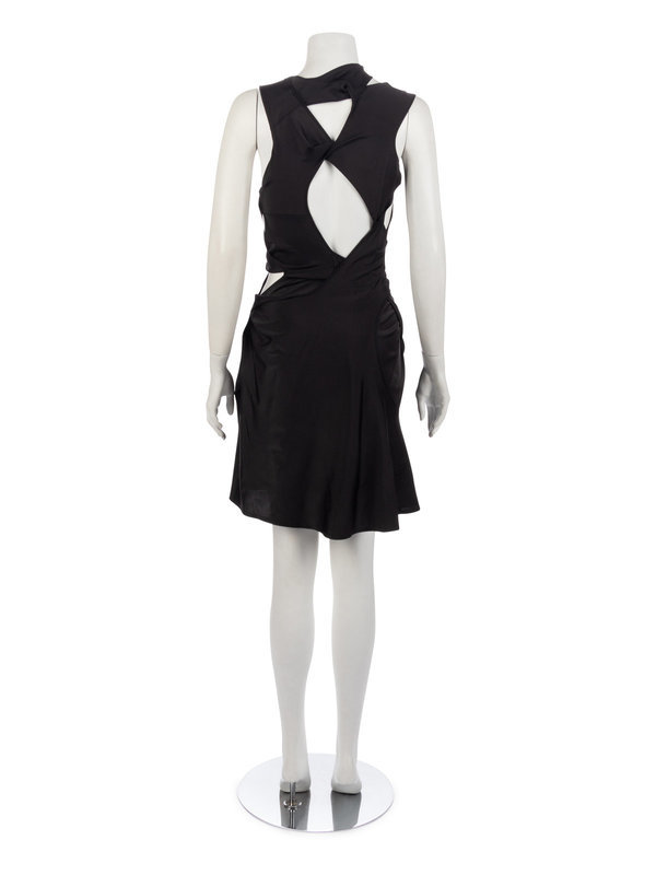 Black poly-blend sleeveless jersey dress with bound peek-a-boo cutaways.