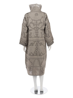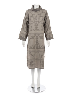 Dual-tone warm gray rayon/wool/cotton blend A-line dress with woven bone motif, cowl neck and long sleeves.