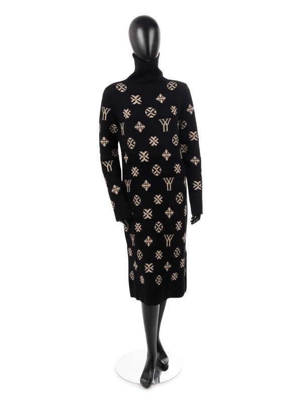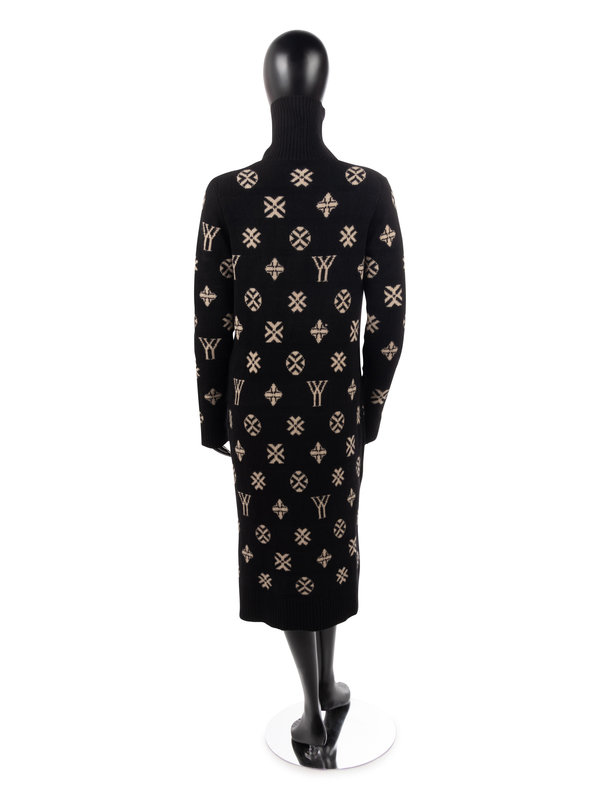 Black with ivory "monogram" wool knit long sleeve shift dress with turtle neck collar.