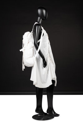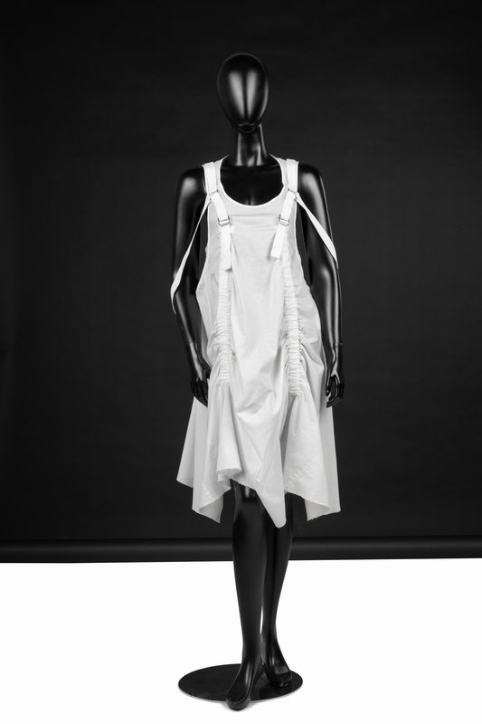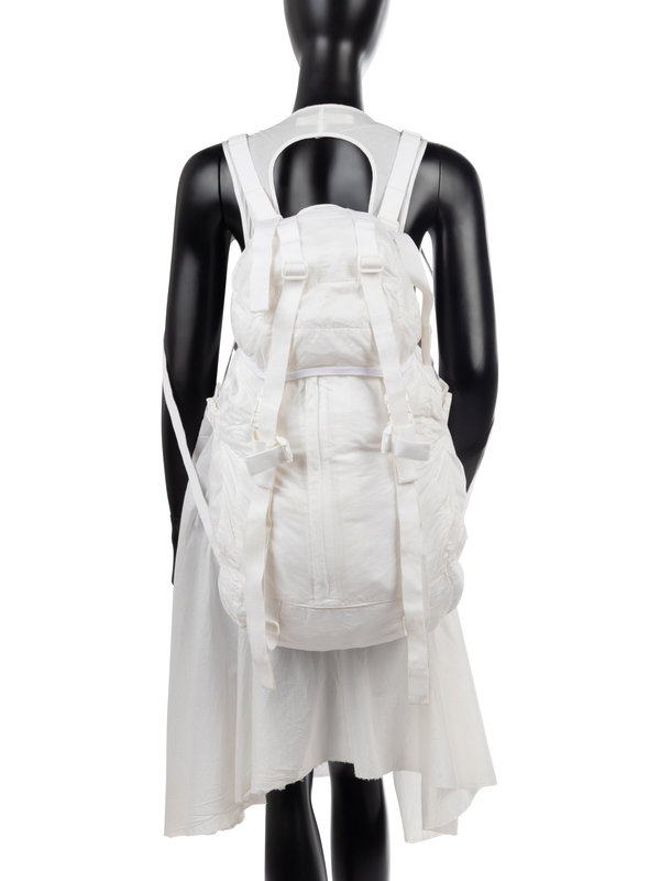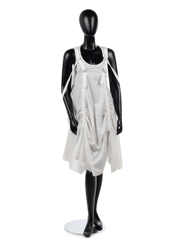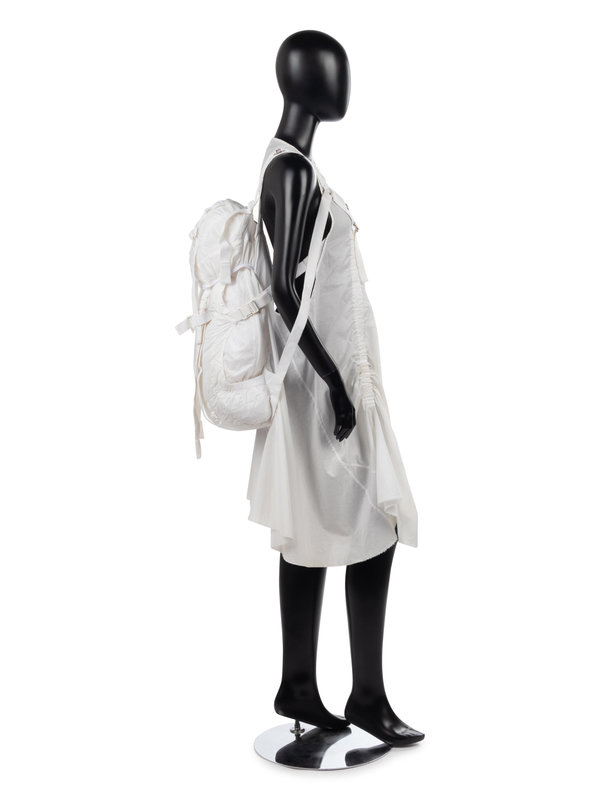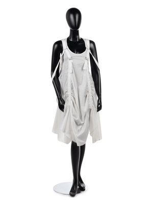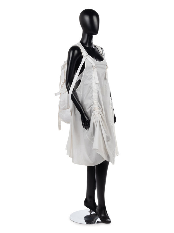 White cotton parachute inspired shift dress with integrated parachute sack on back and cotton twill strapping.