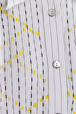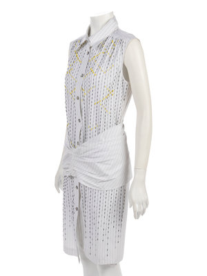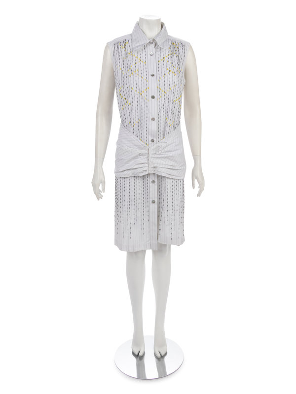 White cotton pinstriped sleeveless shirt dress embellished with black, gray, and yellow beading and center front shell button closure; paired with matching shrug. Found with original sales tag, listed price: $2,480.00.