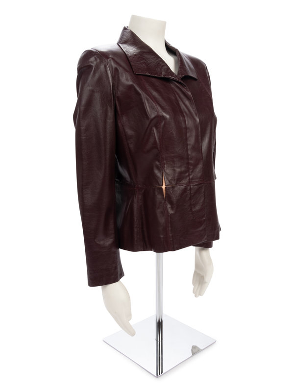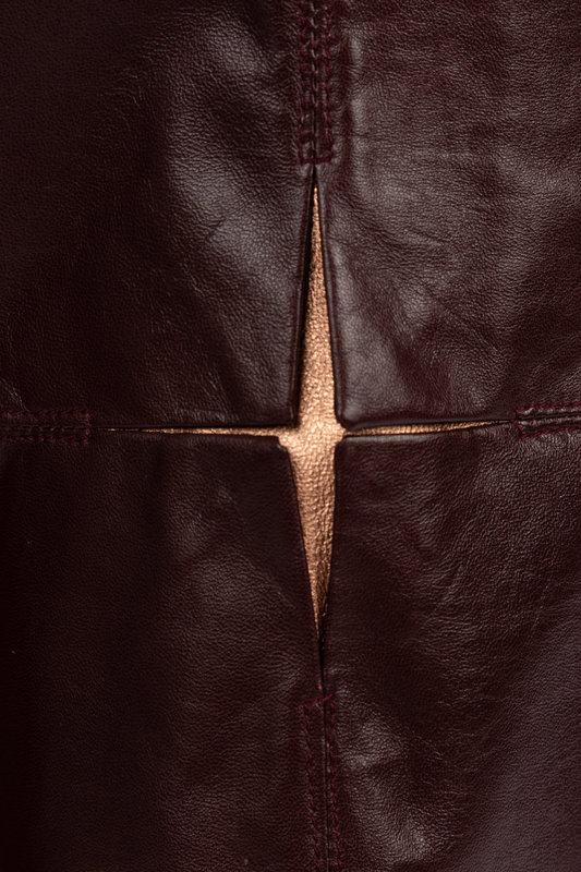 Wine lambskin leather jacket with metallic rose gold leather inserts under origami folds, rolled collar, and center front button closure.
