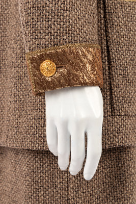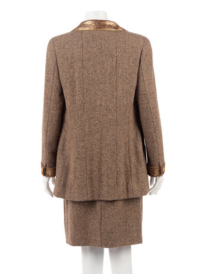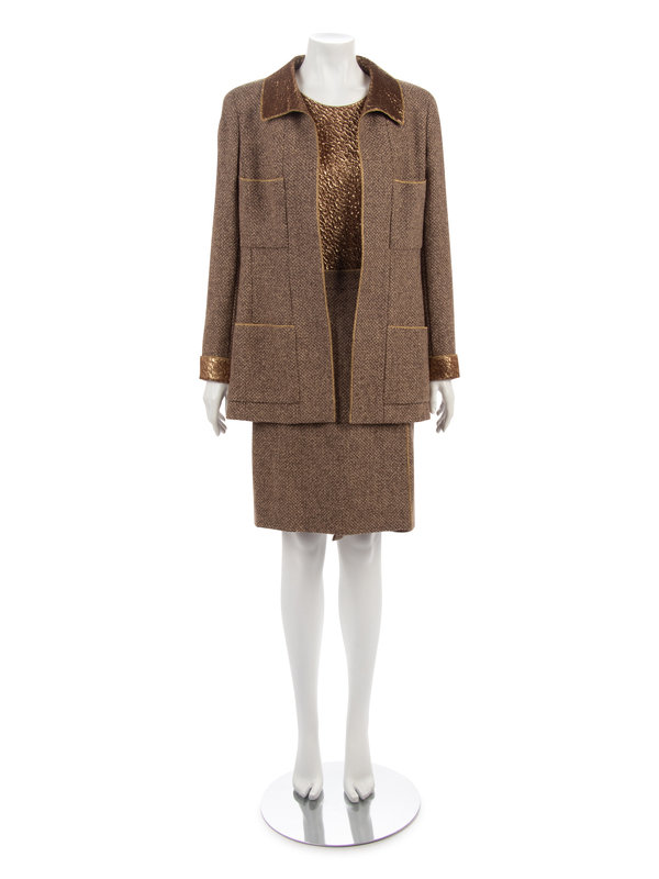 Taupe wool blend tweed three-piece skirt suit with open front cardigan styled jacket detailed with gold-tone thread and bronze silk/lurex blend lamé facing; paired with a matching lamé sleeveless shell top and tweed wrap skirt. Fall 1996. Found with original sales tag, listed price: $3,920.00.
