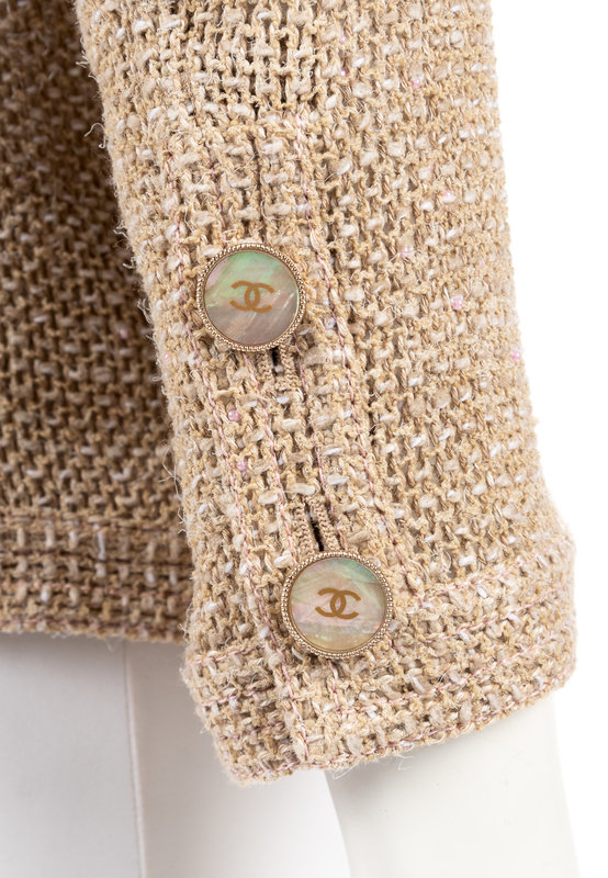 Ecru linen/wool blend loose weave tweed cardigan style jacket inset with pink beading, front hip pockets, and center front shell button closures. Found original sales receipt, listed price: $4,730.00.