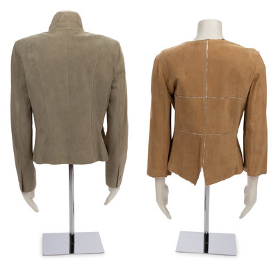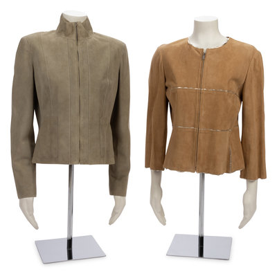 Green suede leather short jacket with stand collar, front patch pockets, and front zipper closure. Found with original sales tag, listed price: $2.795.00.