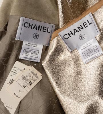 Tan goatskin suede short jacket with gold metallic leather trim and lining, and center front zipper closure.