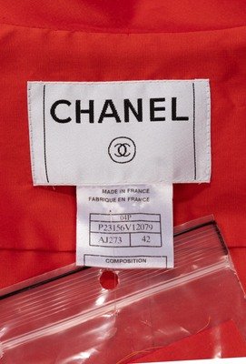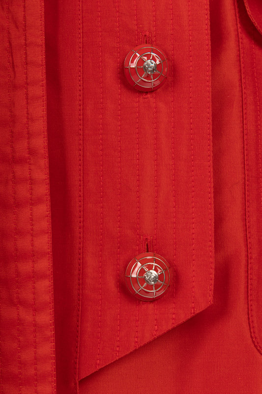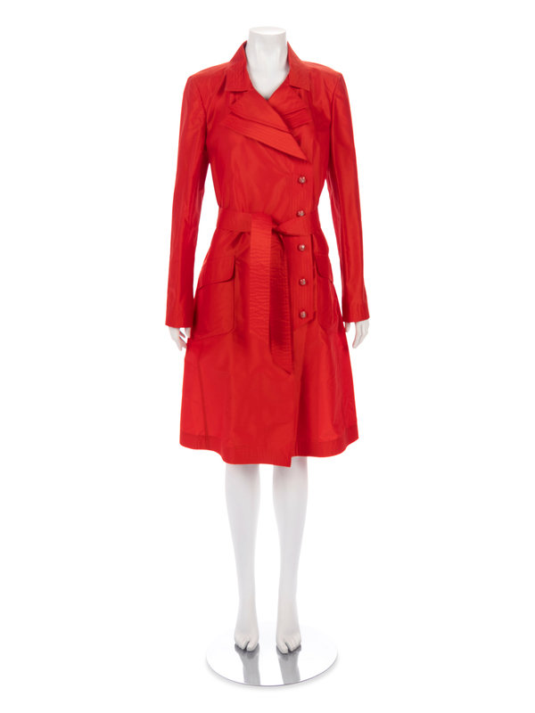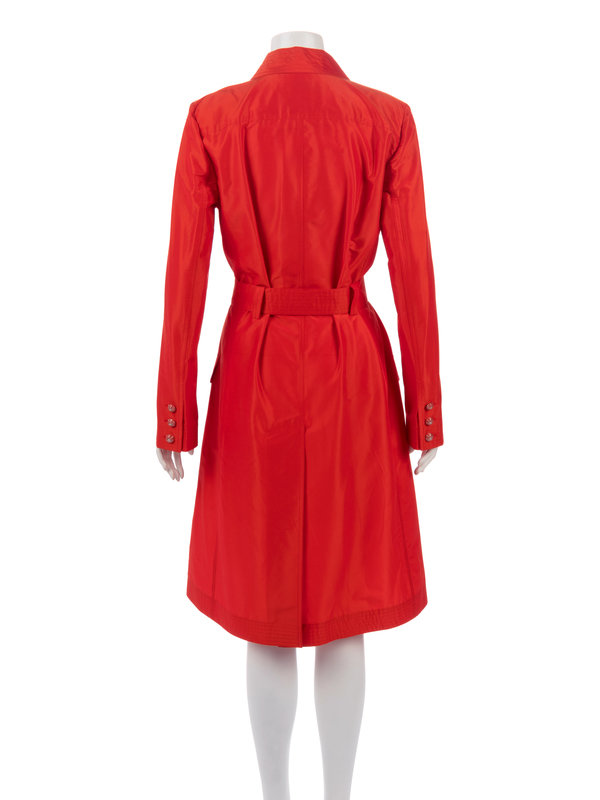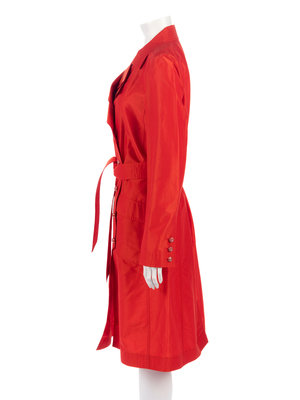 Bright red/orange iridescent silk trench coat with double lapels, front flap patch pockets, asymmetrical button down front opening, and tie belt. Comes with fabric swatch and extra buttons.