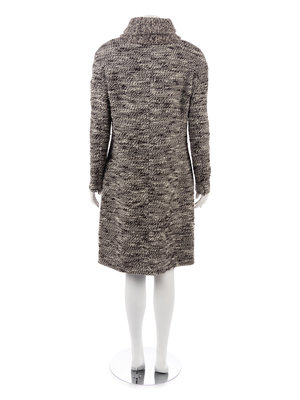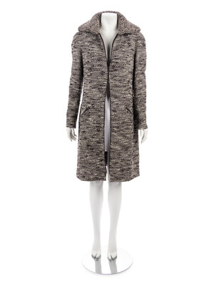 Black and white wool blend tweed coat with double layered rib knit collar, front zip pockets, and center front zipper closure. Found with original sales tag, listed price: $3,480.00.