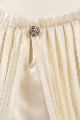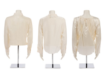 Ivory silk crepe-back satin blouse with wide jewel neckline and cut strips detail. Found with original sales tag, listed price: $3,035.00.