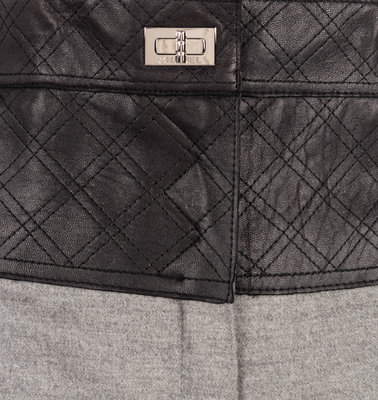 Gray wool blend straight leg pants with black leather topstitched yoke and waistband.