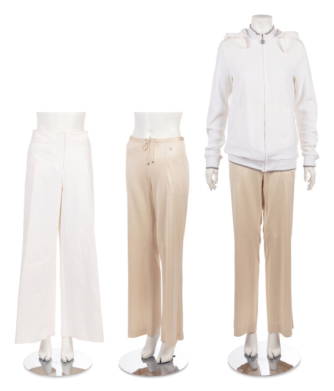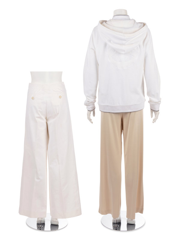 White rayon/cotton French Terrycloth Hoodie with large CC logo applique on back, inset side pockets, and center front zip closure. Found with original sales tag, listed price: $1600.00.