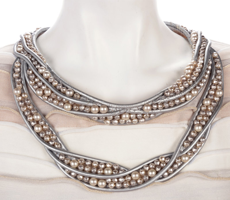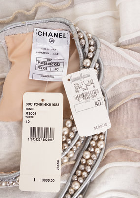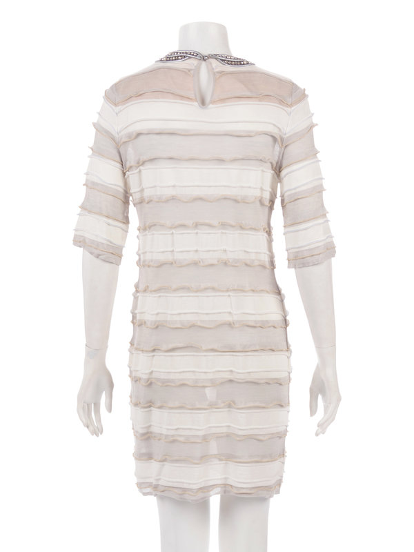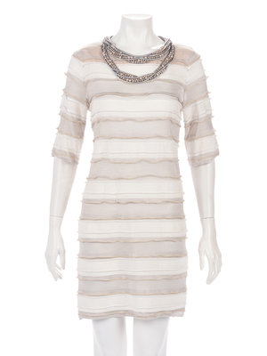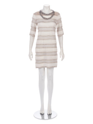 White and gray cotton/silk blend knit dress with silver vinyl and faux-pearl embellished neckline, three-quarter sleeves, and metallic thread edgings. Found with original sales tag, listed price: $3,800.00.