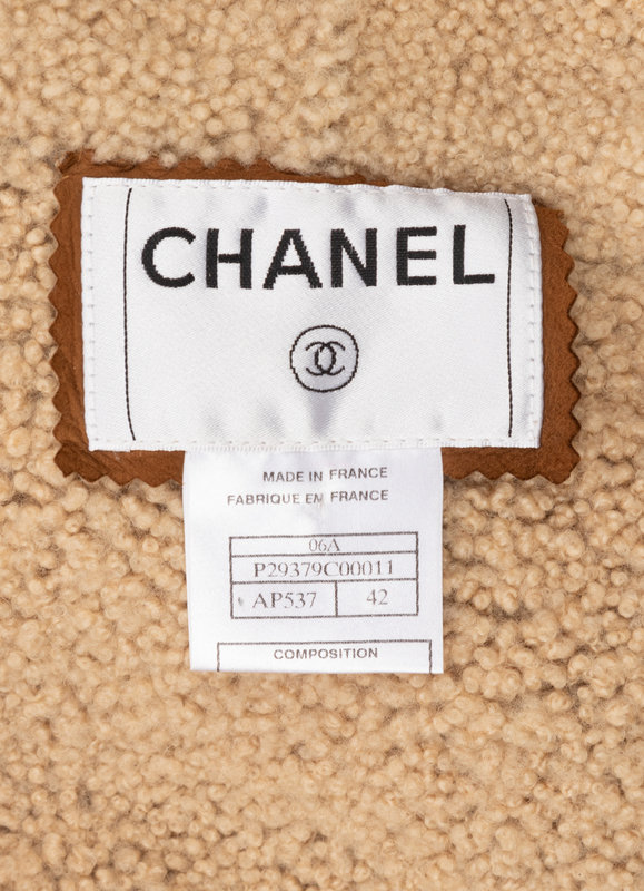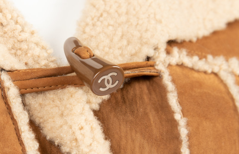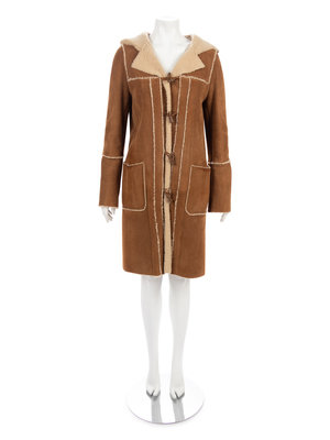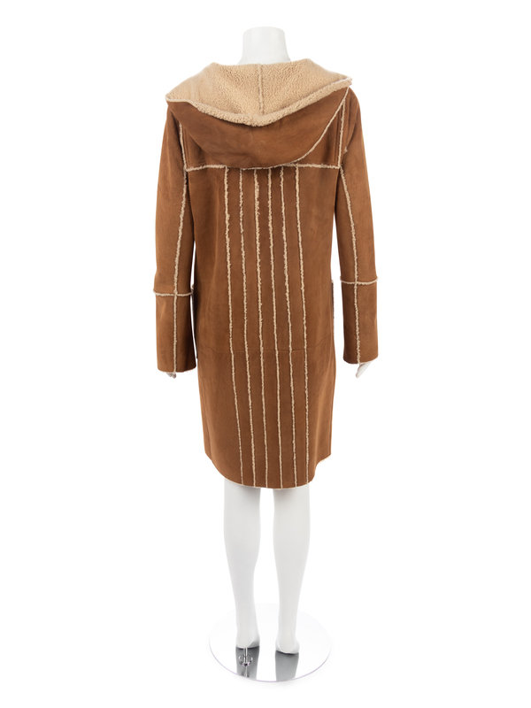 Tan shearling lambswool hooded coat with front patch pockets, and center front horn shape toggles closures.