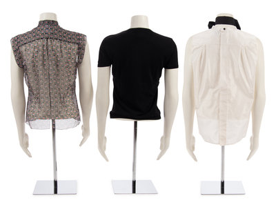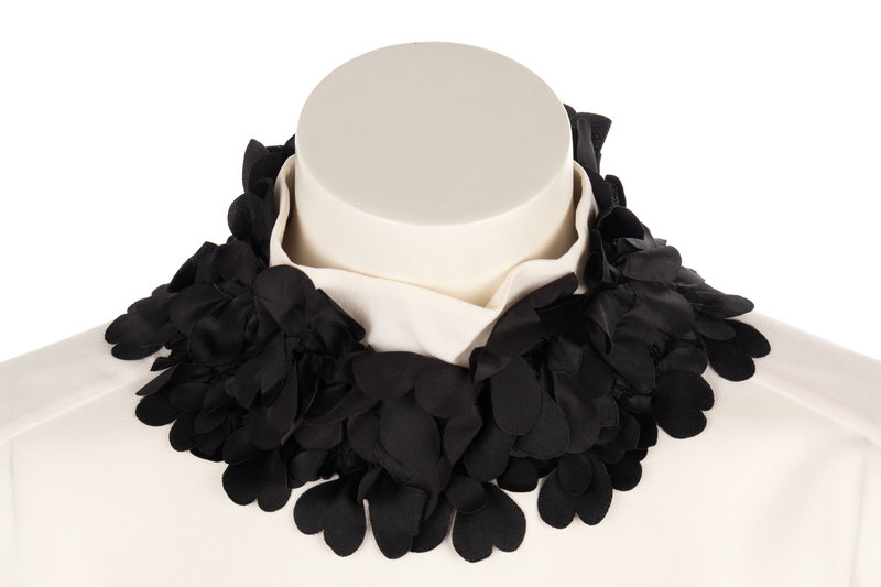 White silk taffeta sleeveless top with ruffled front detail and back button closure; paired with a detached black cotton scarf.