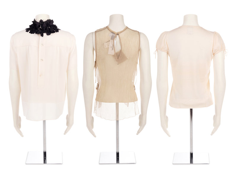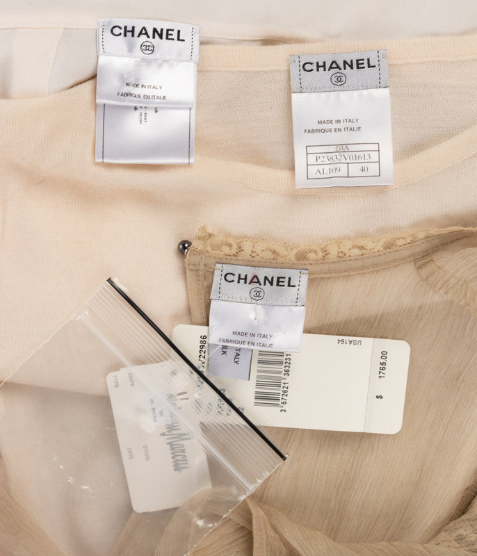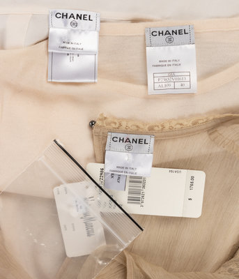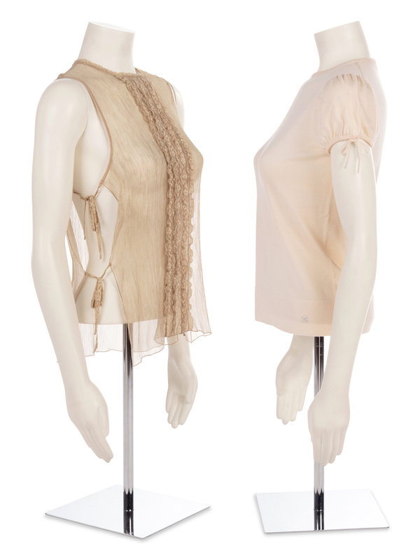 Taupe silk crepe sleeveless top with lace trim and tied side seams. Found with original sales tag, listed price: $1,765.00.