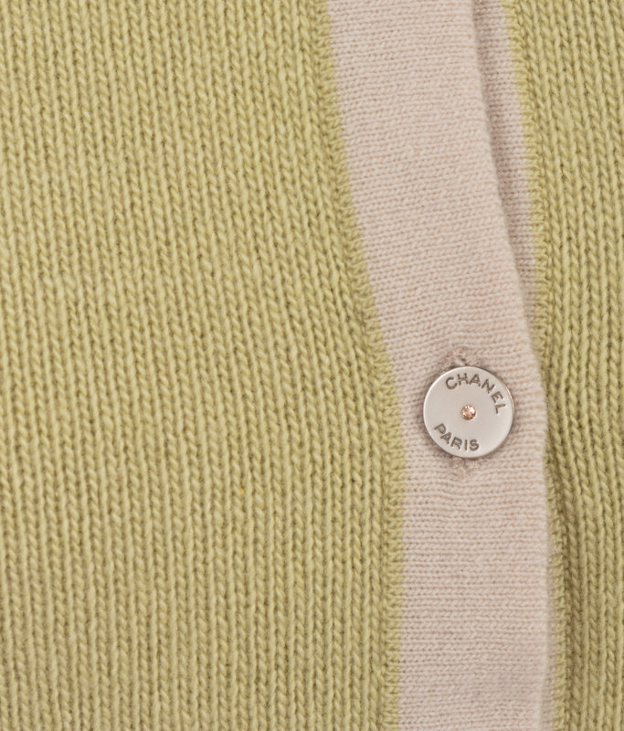 Pale green with ivory trimmed cashmere two-piece set with cardigan and matching sleeveless top. Found with original sales tag, listed price: $2,145.00.