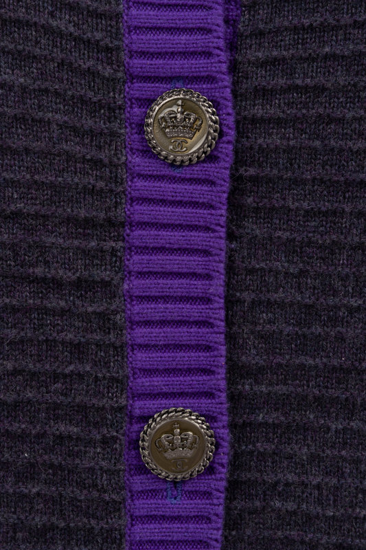 Dark gray and purple trimmed ribbed cashmere cardigan with front button closure.