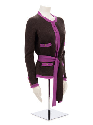 Brown cashmere knit cardigan trimmed with purple, front pockets, and center front button closure with two tie belts.