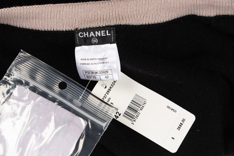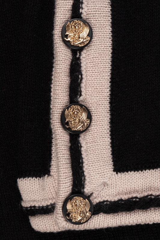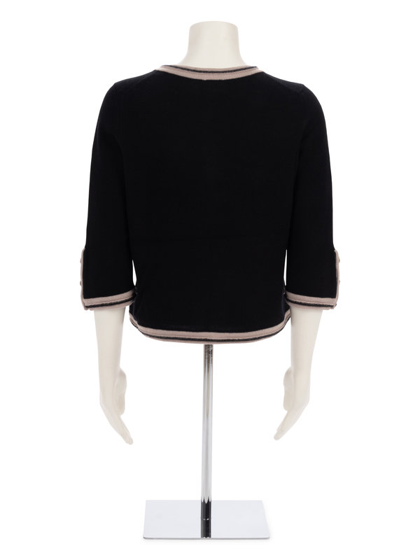 Black cashmere knit cardigan trimmed in lavender, front chest faux pockets, and center front button closure. Found with original sales tag, listed price: $2,655.00.