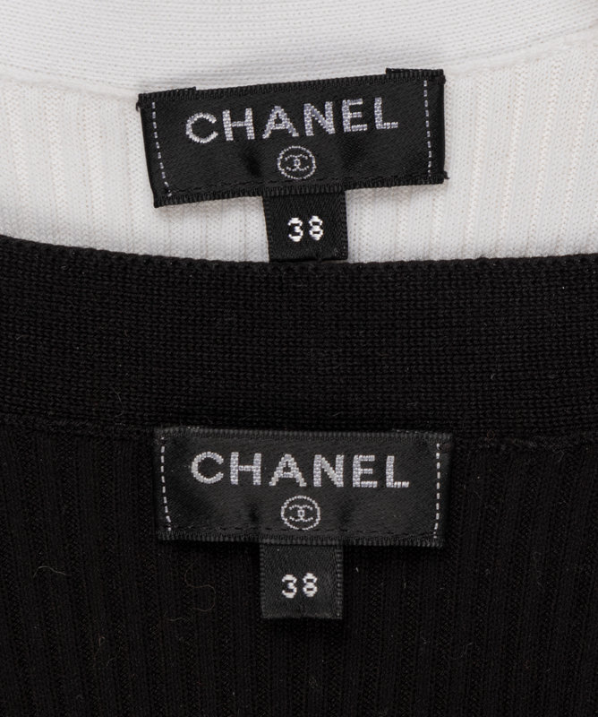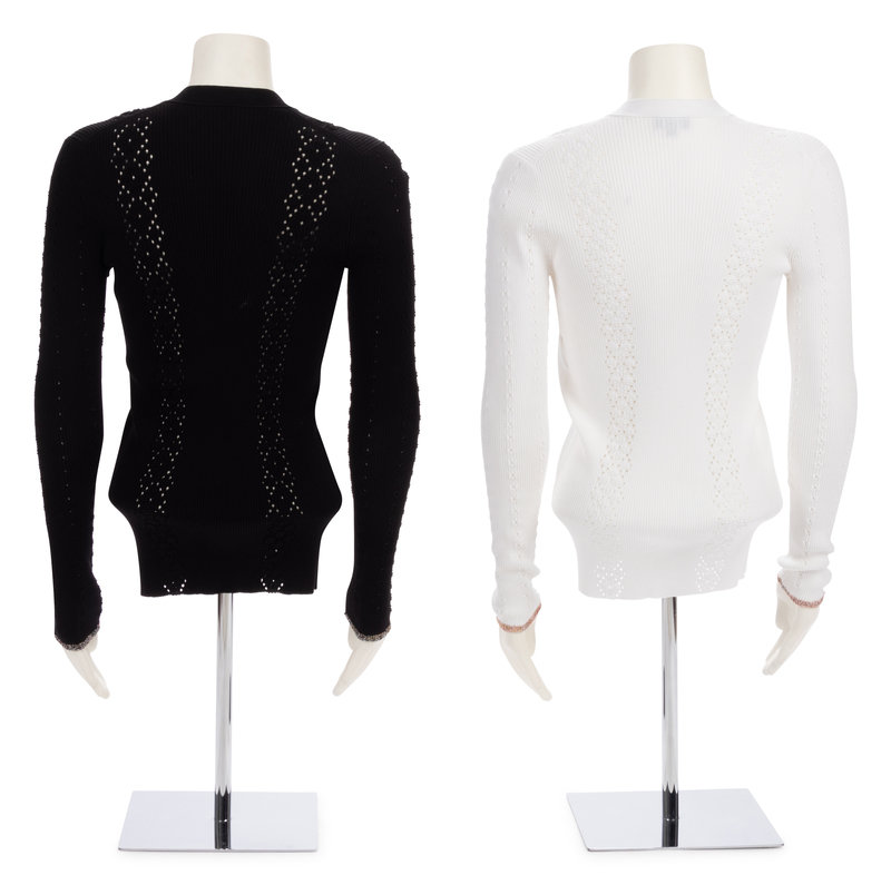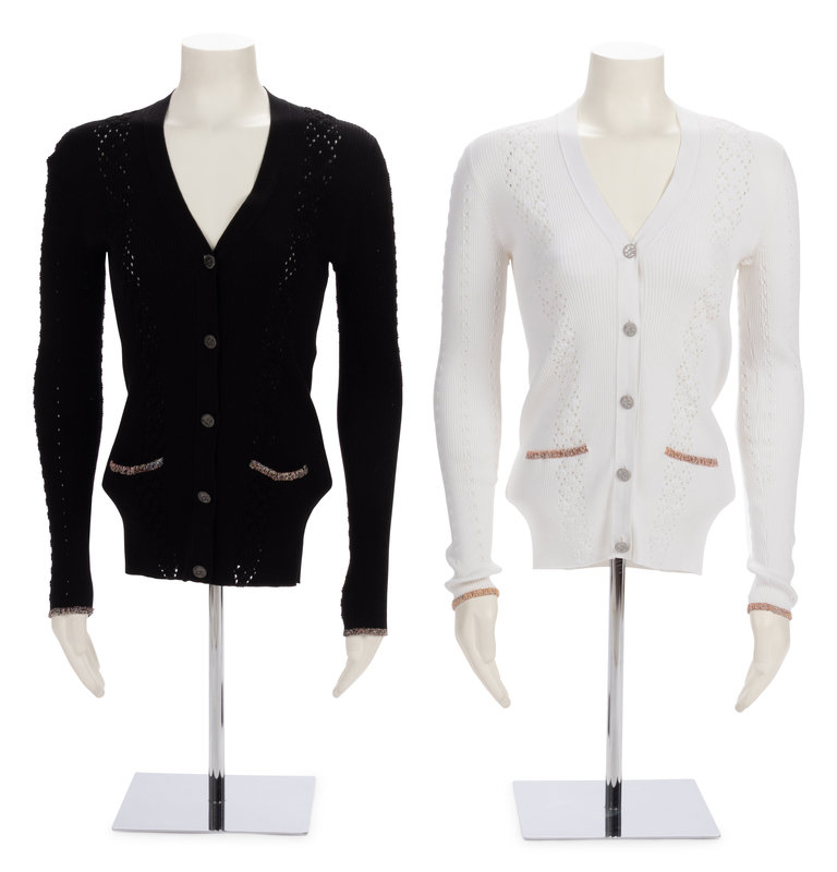 Black cotton pointelle knit cardigan with pink tweed trim and center front button closure.