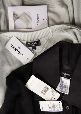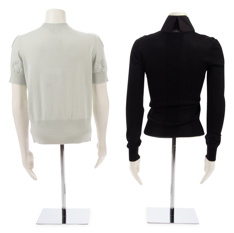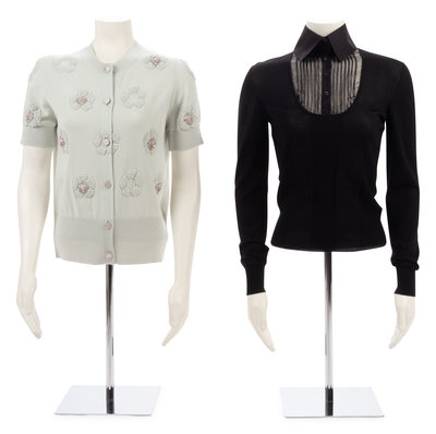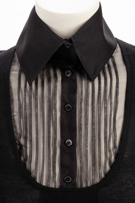 Black cashmere/silk blend knit sweater with inset silk chiffon neckline and collar. Found with original sales tag, listed price: $965.00.