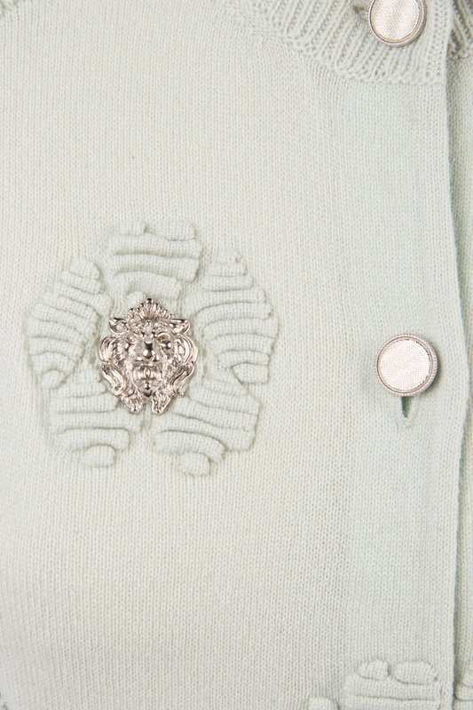 Light green cashmere knit short sleeve sweater with silver-tone lion head medallions and front button closure. Found with original sales tag, listed price is missing price.