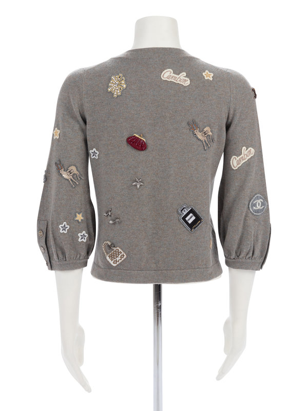 Gray cashmere cardigan embellished with appliques and metal pins, full gathered sleeves, and center front button closure. Found with original sales tag, listed price: $4,980.00.