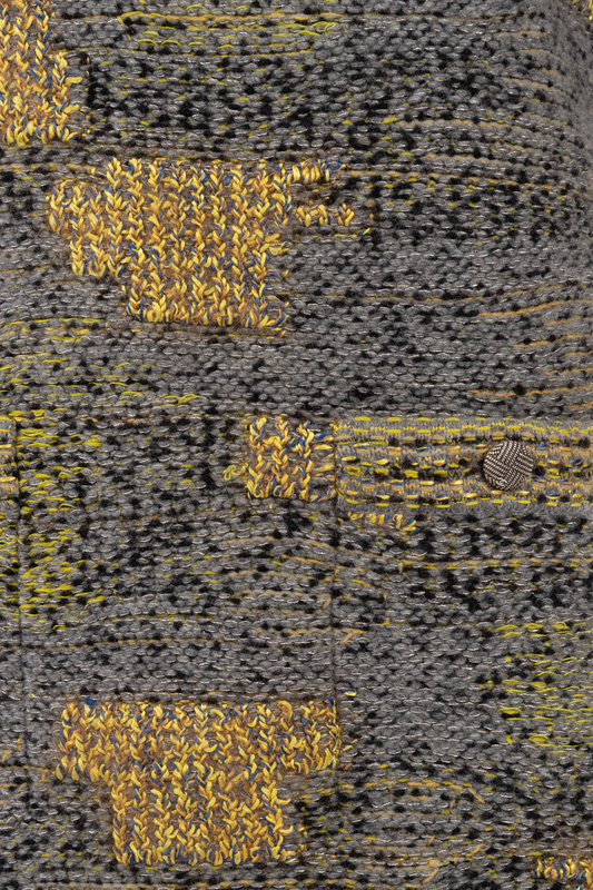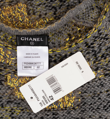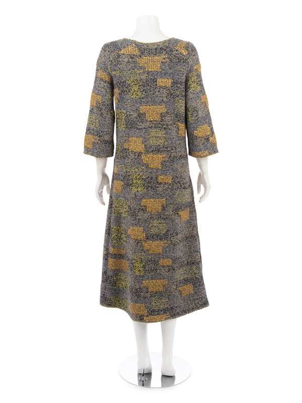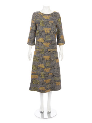 Grey and yellow wool/cashmere blend A-line knit dress with flared sleeves. Found with original sales tag, listed price: $3500.00.