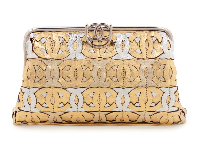 Gold and silver metallic leather die-cut CC logo frame clutch bag with dual interior compartments and silver-tone CC logo flip clasp. Found with original sales tag, listed price: $2,595.00.