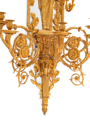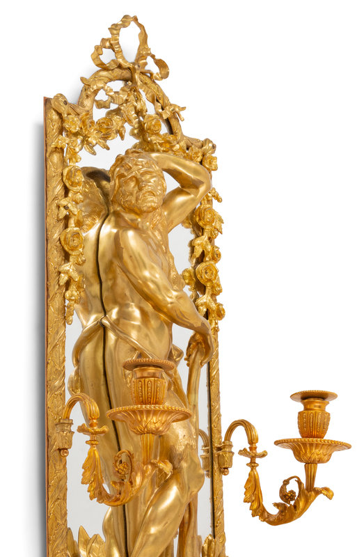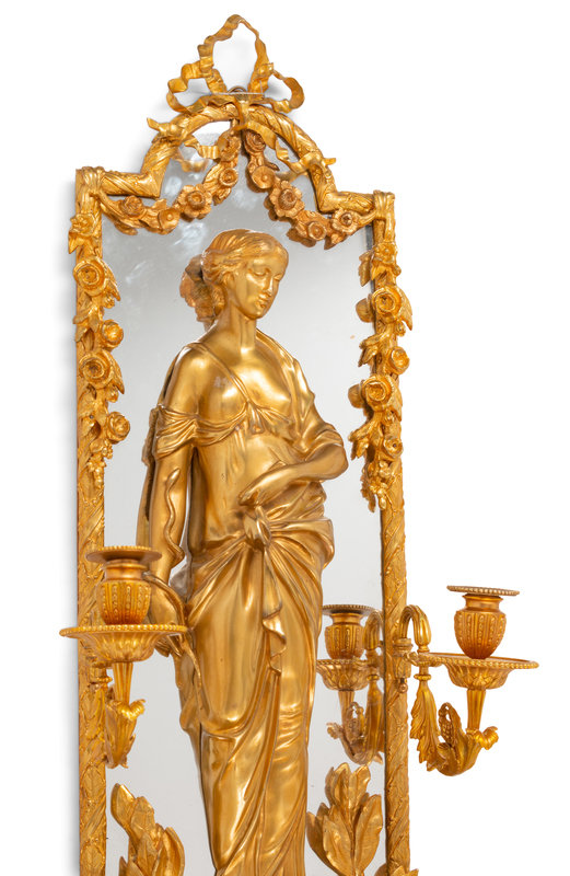 A Pair of Large Louis XVI Style Mirrored Gilt Bronze Figural Sconces