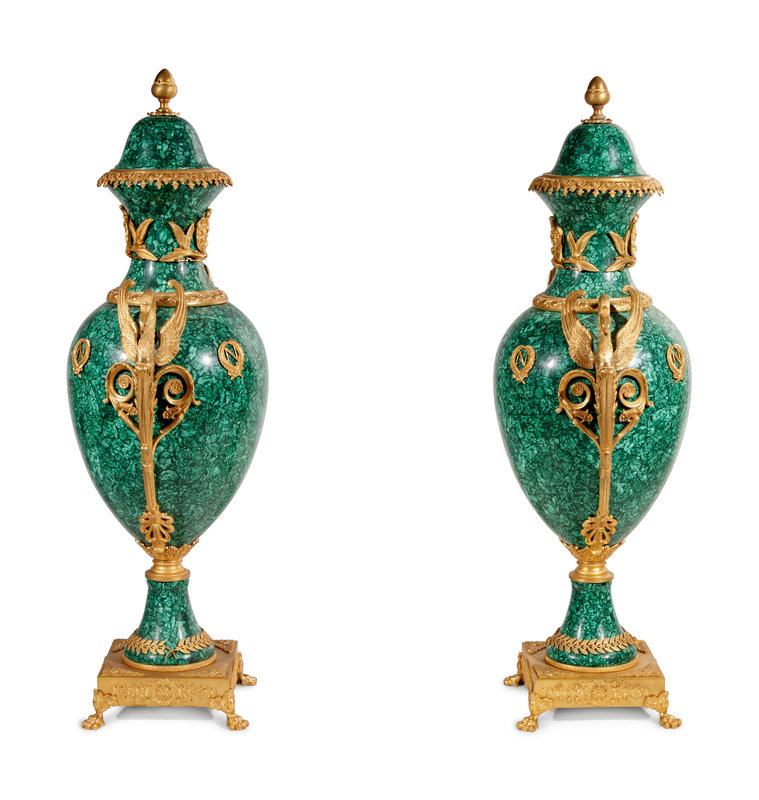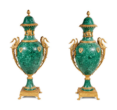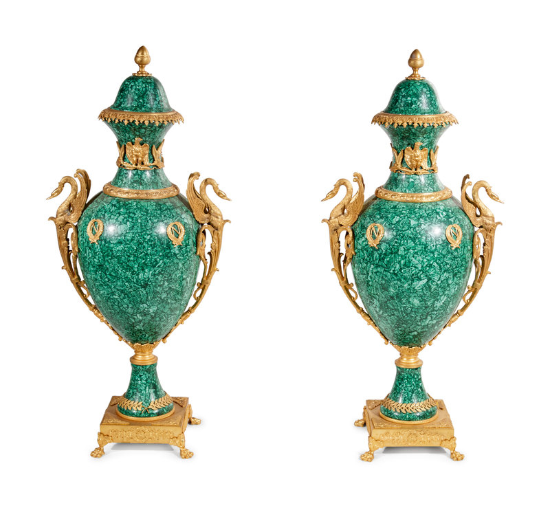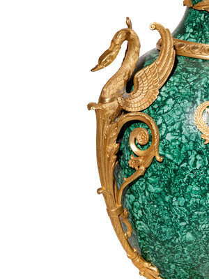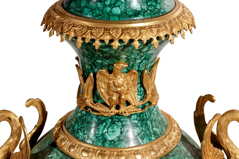 A Pair of Empire Style Gilt Bronze Mounted Malachite Veneered Urns