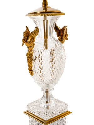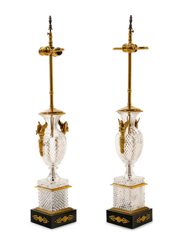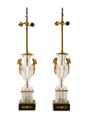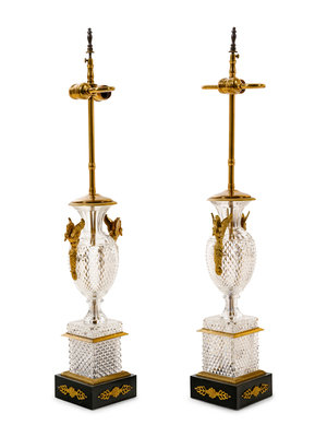A Pair of Empire Style Gilt Metal and Cut Glass Vases Mounted as Lamps