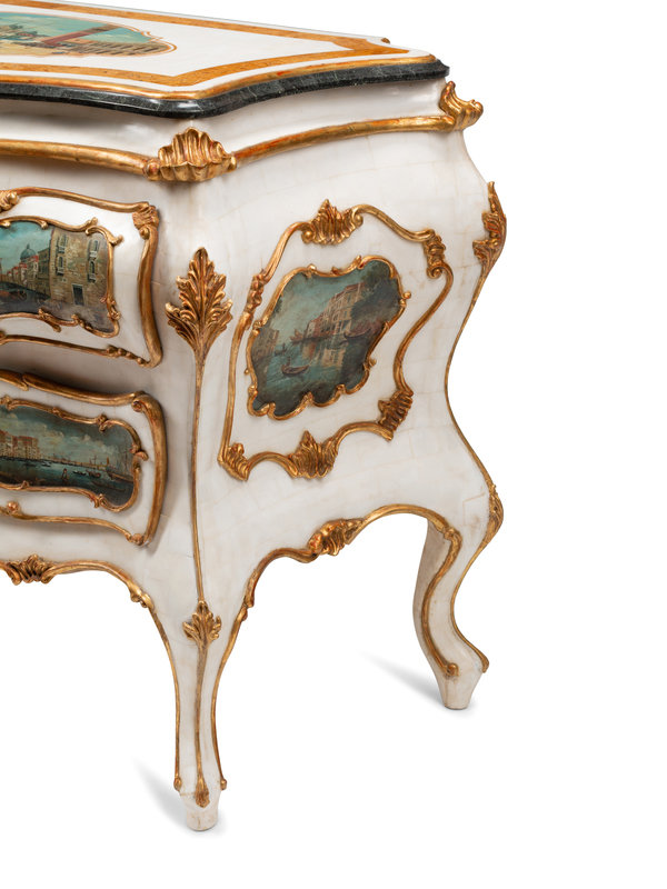 A Venetian Style Marble Veneered, Painted and Parcel Gilt Commode